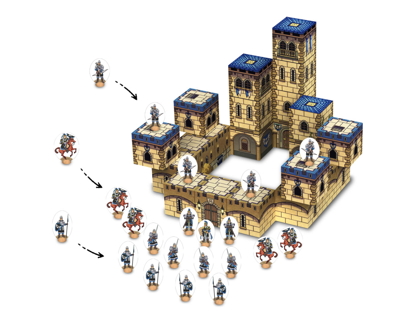 Además puedes crear tus propias aventuras jugando con los personajes, colócalos como quieras para defender tu castillo. Los arqueros en las murallas, los caballeros en posición de defensa y tu comandante listo para dar órdenes.